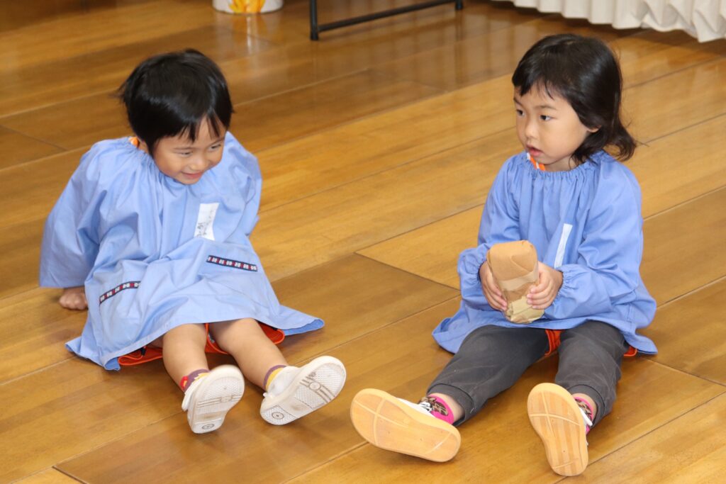 ♬どんぐりころころ・・では円になり、大きなどんぐりを歌に合わせてお隣に渡します。