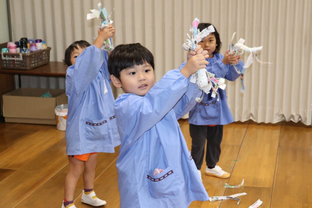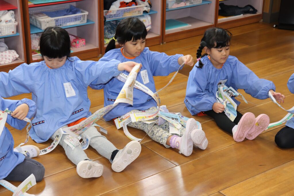 最後は破った新聞紙を抱え、音階を歌いながら高いドで上に向かって投げました。